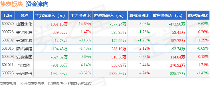 从资金流向上来看,当日焦炭板块主力资金净流出2278.54万元,游资资金净流入2969.26万元,散户资金净流出690.72万元。焦炭板块个股资金流向见下表:
