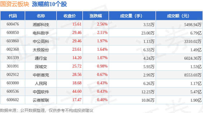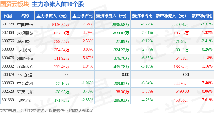 从资金流向上来看,当日国资云板块主力资金净流出12.67亿元,游资资金净流入2439.98万元,散户资金净流入12.43亿元。国资云板块个股资金流向见下表: