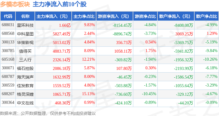 从资金流向上来看,当日多模态板块主力资金净流出8.73亿元,游资资金净流入7590.81万元,散户资金净流入7.97亿元。多模态板块个股资金流向见下表: