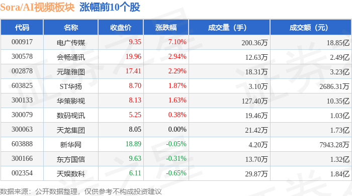 证券之星消息,12月18日Sora/AI视频板块较上一交易日下跌0.34%,易点天下领跌。当日上证指数报收于3876.37,上涨0.16%。深证成指报收于13053.98,下跌1.29%。Sora/AI视频板块个股涨跌见下表: