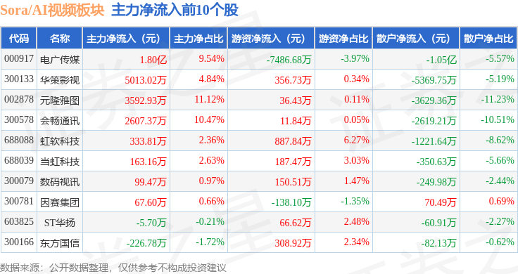 从资金流向上来看,当日Sora/AI视频板块主力资金净流入1467.07万元,游资资金净流入1.31亿元,散户资金净流出1.46亿元。Sora/AI视频板块个股资金流向见下表: