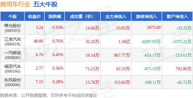 个股表现方面,商用车行业当日领涨股为曙光股份(600303),该股当日报收3.24,上涨0.93%,成交量14.6万,主力资金净流入33.05万元。江淮汽车(600418)以上涨0.76%紧随其后,该股当日成交量32.2万,主力资金净流入1.38亿元。除此之外,一汽解放(000800)、福田汽车(600166)、东风股份(600006)均进入当日牛股之列。具体个股列表见下表: