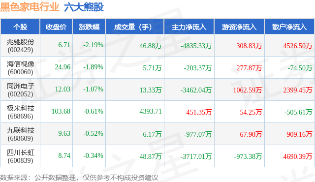 个股表现方面,黑色家电行业当日领跌股为兆驰股份(002429),该股当日报收6.71,下跌2.19%,成交量46.88万,主力资金净流出4835.33万元。海信视像(600060)以下跌1.89%紧随其后,该股当日成交量5.71万,主力资金净流出203.37万元。除此之外,同洲电子(002052)、极米科技(688696)、九联科技(688609)均进入当日熊股之列。具体个股列表见下表:
