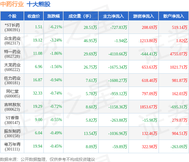 个股表现方面,中药行业当日领跌股为*ST长药(300391),该股当日报收1.51,下跌6.21%,成交量28.51万,主力资金净流出727.83万元。众生药业(002317)以下跌3.24%紧随其后,该股当日成交量46.95万,主力资金净流出1.94亿元。除此之外,特一药业(002728)、太龙药业(600222)、佐力药业(300181)均进入当日熊股之列。具体个股列表见下表: