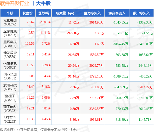 个股表现方面,软件开发行业当日领涨股为嘉和美康(688246),该股当日报收25.67,上涨20.01%,成交量11.72万,主力资金净流入3014.93万元。卫宁健康(300253)以上涨11.11%紧随其后,该股当日成交量292.6万,主力资金净流入3.35亿元。除此之外,星环科技(688031)、佳发教育(300559)、恒锋信息(300605)均进入当日牛股之列。具体个股列表见下表: