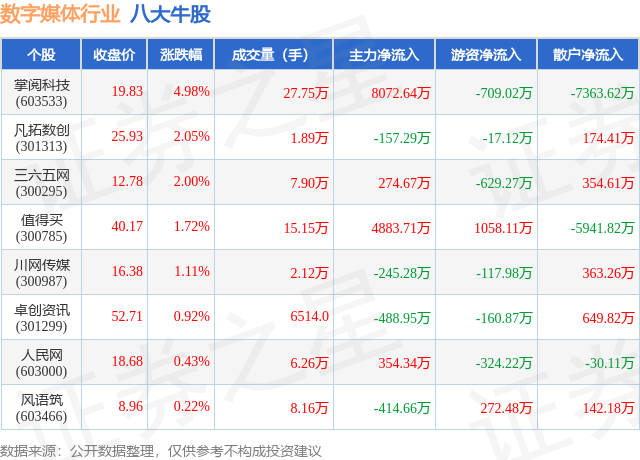 个股表现方面,数字媒体行业当日领涨股为掌阅科技(603533),该股当日报收19.83,上涨4.98%,成交量27.75万,主力资金净流入8072.64万元。凡拓数创(301313)以上涨2.05%紧随其后,该股当日成交量1.89万,主力资金净流出157.29万元。除此之外,三六五网(300295)、值得买(300785)、川网传媒(300987)均进入当日牛股之列。具体个股列表见下表:
