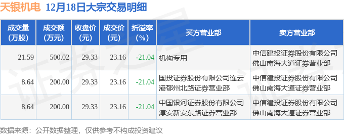 证券之星消息,12月18日天银机电发生大宗交易,交易数据如下: