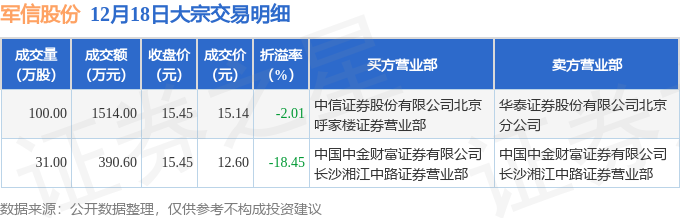 证券之星消息,12月18日军信股份发生大宗交易,交易数据如下: