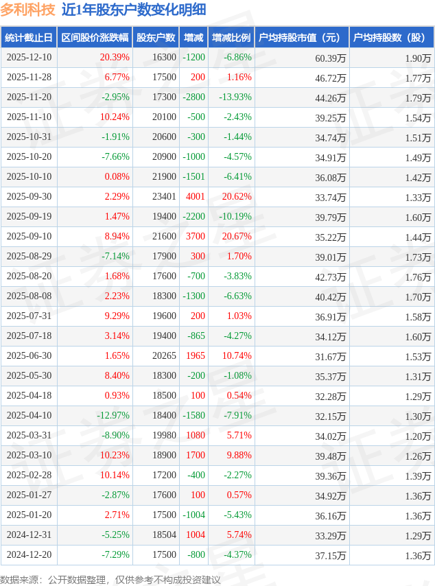 从股价来看,2025年11月28日至2025年12月10日,多利科技区间涨幅为20.39%,在此期间股东户数减少1200.0户,减幅为6.86%。