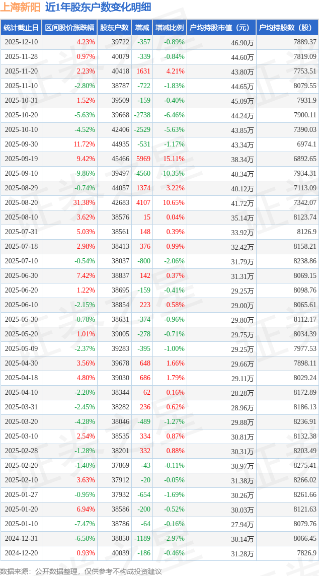 从股价来看,2025年11月28日至2025年12月10日,上海新阳区间涨幅为4.23%,在此期间股东户数减少357.0户,减幅为0.89%。