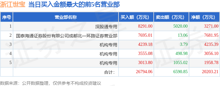 证券之星消息,沪深交易所2025年12月18日公布的交易公开信息显示,浙江世宝(002703)因日涨幅偏离值达到7%的前5只证券登上龙虎榜。此次是近5个交易日内第2次上榜。