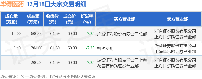 证券之星消息,12月18日毕得医药发生大宗交易,交易数据如下: