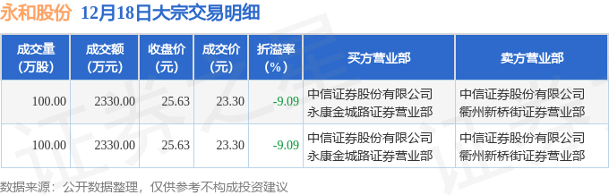 证券之星消息,12月18日永和股份发生大宗交易,交易数据如下: