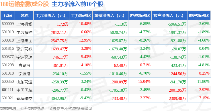 资金流向方面,180运输(000027)指数成份股当日主力资金净流入合计1.44亿元,游资资金净流出合计1.88亿元,散户资金净流入合计4428.39万元。成份股资金流向详情见下表: