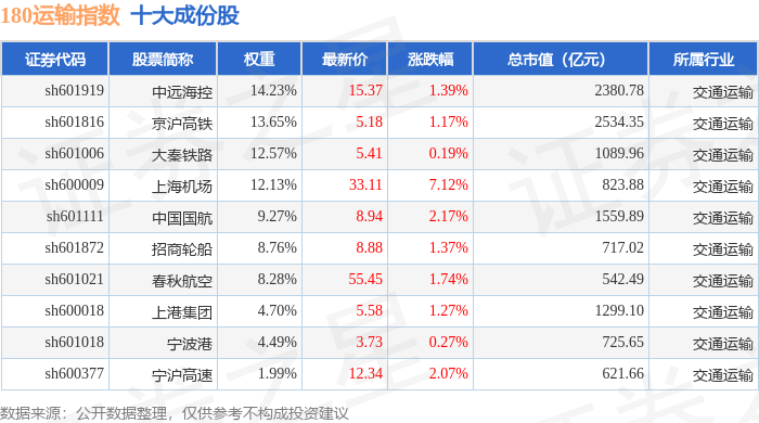 证券之星消息,12月18日,180运输(000027)指数报收于774.98点,涨1.93%,成交59.02亿元,换手率0.35%。当日该指数成份股中,上涨的有12家,上海机场以7.12%的涨幅领涨。