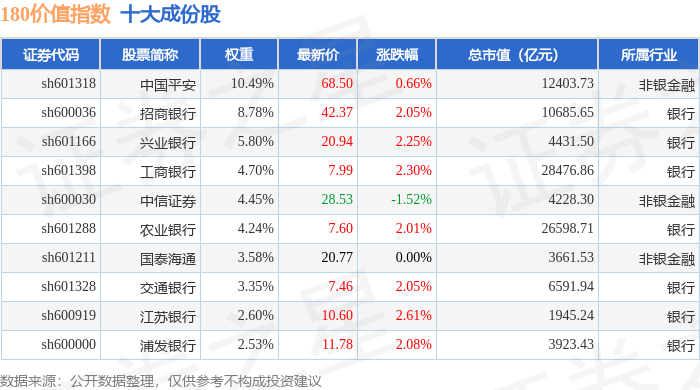 证券之星消息,12月18日,180价值(000029)指数报收于4454.19点,涨1.14%,成交548.95亿元,换手率0.27%。当日该指数成份股中,上涨的有46家,陕西煤业以3.74%的涨幅领涨,下跌的有13家,华泰证券以3.08%的跌幅领跌。