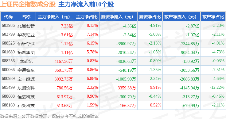 资金流向方面,上证民企(000049)指数成份股当日主力资金净流出合计10.72亿元,游资资金净流出合计3.84亿元,散户资金净流入合计14.56亿元。成份股资金流向详情见下表:
