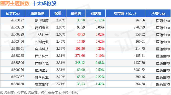 医药主题(000121)指数十大成份股详情如下: