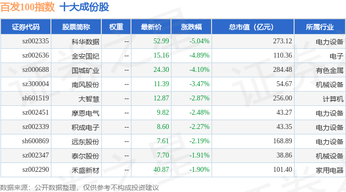 证券之星消息,12月18日,百发100(000851)指数报收于19705.02点,涨0.03%,成交397.33亿元,换手率1.22%。当日该指数成份股中,上涨的有49家,深中华A以10.05%的涨幅领涨,下跌的有36家,科华数据以5.04%的跌幅领跌。