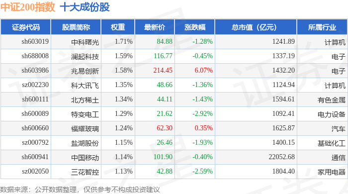 中证200(000904)指数十大成份股详情如下: