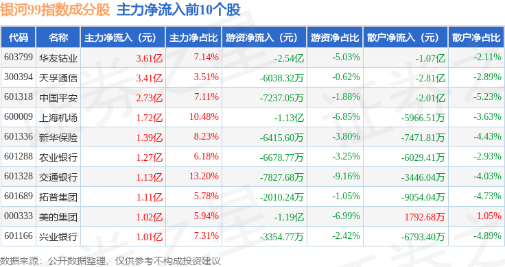 资金流向方面,银河99(000959)指数成份股当日主力资金净流出合计102.26亿元,游资资金净流入合计35.03亿元,散户资金净流入合计67.23亿元。成份股资金流向详情见下表: