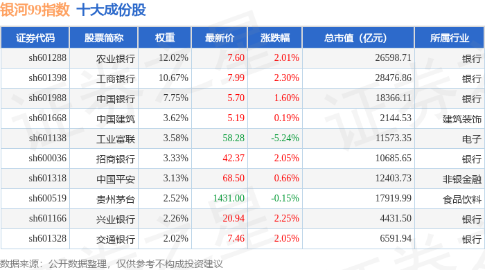 证券之星消息,12月18日,银河99(000959)指数报收于8164.07点,涨0.41%,成交2194.05亿元,换手率0.37%。当日该指数成份股中,上涨的有38家,上海机场以7.12%的涨幅领涨,下跌的有57家,沪电股份以5.4%的跌幅领跌。
