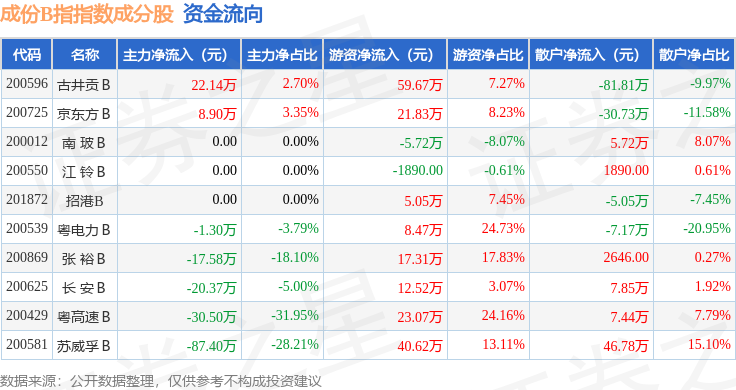 资金流向方面,成份B指(399003)指数成份股当日主力资金净流出合计126.1万元,游资资金净流入合计182.63万元,散户资金净流出合计56.52万元。成份股资金流向详情见下表: