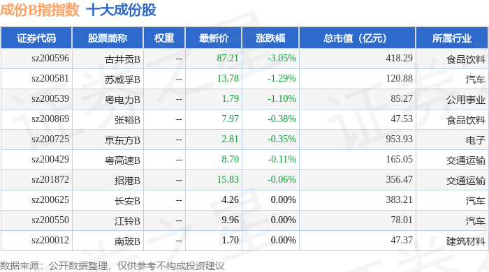 成份B指(399003)指数十大成份股详情如下: