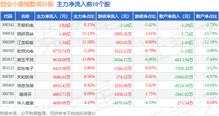资金流向方面,创业小盘(399020)指数成份股当日主力资金净流出合计5.65亿元,游资资金净流出合计6.44亿元,散户资金净流入合计12.08亿元。成份股资金流向详情见下表: