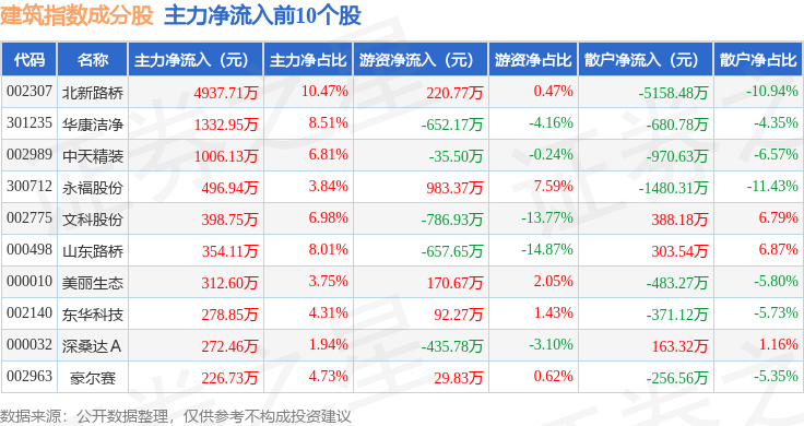 资金流向方面,建筑指数(399235)成份股当日主力资金净流出合计2.26亿元,游资资金净流出合计1507.45万元,散户资金净流入合计2.41亿元。成份股资金流向详情见下表: