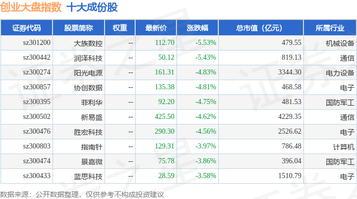 创业大盘(399293)指数十大成份股详情如下: