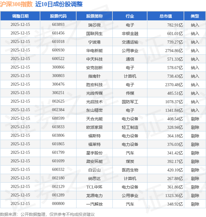 近10日内沪深300(399300)指数成份股做了调整,新纳入了11只股票,剔除了11只股票。