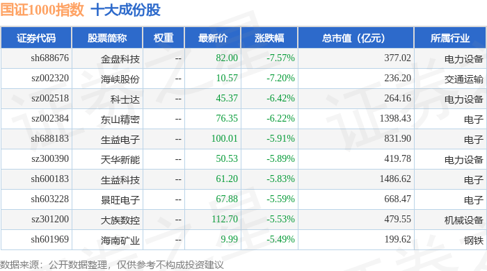 国证1000(399311)指数十大成份股详情如下: