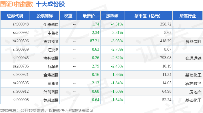 证券之星消息,12月18日,国证B指(399318)指数报收于4987.88点,跌1.03%,成交2.08亿元,换手率0.15%。当日该指数成份股中,上涨的有22家,深中华B以4.97%的涨幅领涨,下跌的有46家,伊泰B股以4.51%的跌幅领跌。