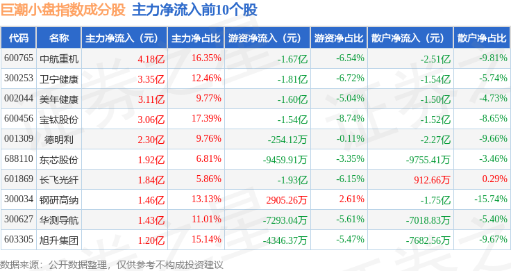 资金流向方面,巨潮小盘(399316)指数成份股当日主力资金净流出合计46.19亿元,游资资金净流入合计1.58亿元,散户资金净流入合计44.17亿元。成份股资金流向详情见下表: