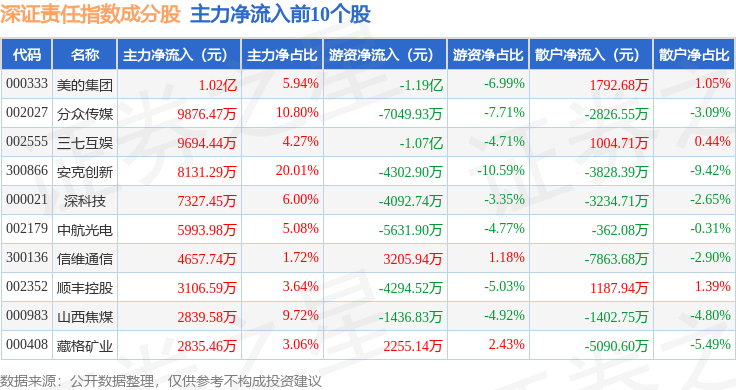 资金流向方面,深证责任(399341)指数成份股当日主力资金净流出合计34.56亿元,游资资金净流入合计2.16亿元,散户资金净流入合计32.39亿元。成份股资金流向详情见下表:
