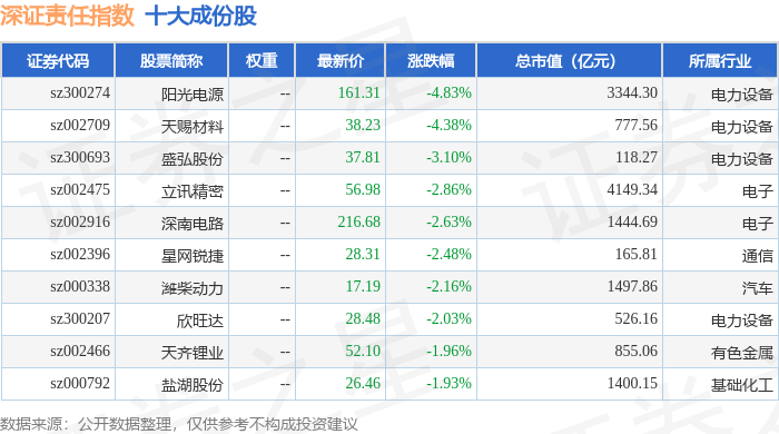 证券之星消息,12月18日,深证责任(399341)指数报收于1626.28点,跌1.03%,成交661.42亿元,换手率1.04%。当日该指数成份股中,上涨的有38家,百洋医药以3.25%的涨幅领涨,下跌的有59家,阳光电源以4.83%的跌幅领跌。
