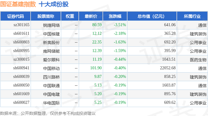 证券之星消息,12月18日,国证基建(399359)指数报收于2664.75点,涨0.43%,成交163.57亿元,换手率0.3%。当日该指数成份股中,上涨的有31家,上海机场以7.12%的涨幅领涨,下跌的有13家,锐捷网络以3.51%的跌幅领跌。