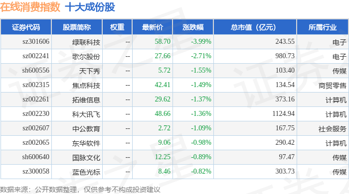 在线消费(399361)指数十大成份股详情如下: