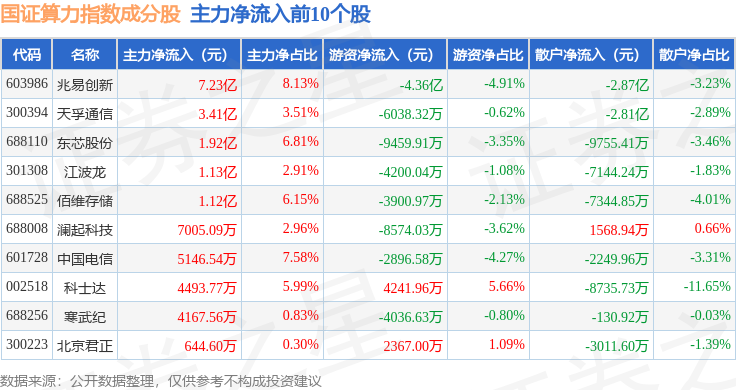 资金流向方面,国证算力(399363)指数成份股当日主力资金净流出合计87.73亿元,游资资金净流入合计31.51亿元,散户资金净流入合计56.22亿元。成份股资金流向详情见下表: