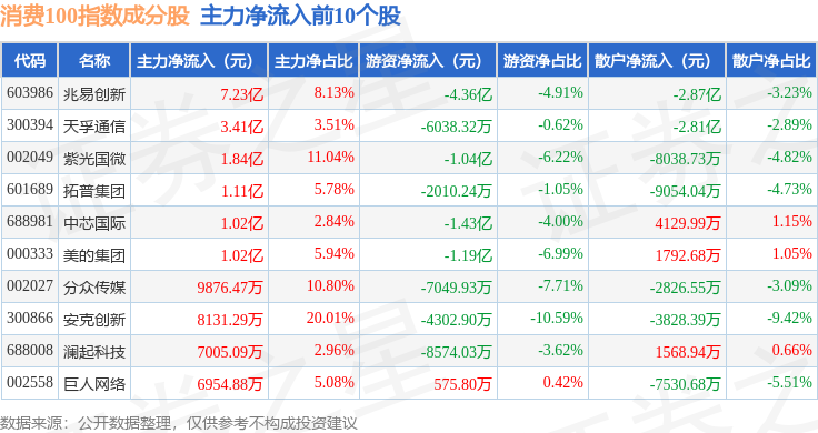资金流向方面,消费100(399364)指数成份股当日主力资金净流出合计111.47亿元,游资资金净流入合计32.66亿元,散户资金净流入合计78.81亿元。成份股资金流向详情见下表: