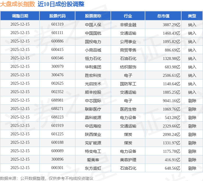 近10日内大盘成长(399372)指数成份股做了调整,新纳入了9只股票,剔除了9只股票。