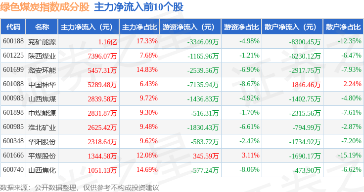 资金流向方面,绿色煤炭(399436)指数成份股当日主力资金净流入合计4.61亿元,游资资金净流出合计2.16亿元,散户资金净流出合计2.46亿元。成份股资金流向详情见下表: