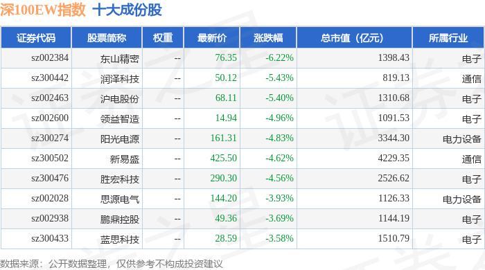 证券之星消息,12月18日,深100EW(399632)指数报收于5092.23点,跌0.9%,成交1707.37亿元,换手率0.92%。当日该指数成份股中,上涨的有28家,新诺威以7.23%的涨幅领涨,下跌的有71家,东山精密以6.22%的跌幅领跌。