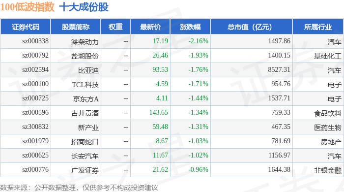 100低波(399645)指数十大成份股详情如下: