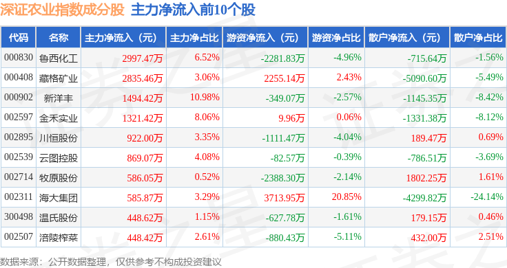 资金流向方面,深证农业(399669)指数成份股当日主力资金净流出合计8.18亿元,游资资金净流入合计7144.1万元,散户资金净流入合计7.47亿元。成份股资金流向详情见下表: