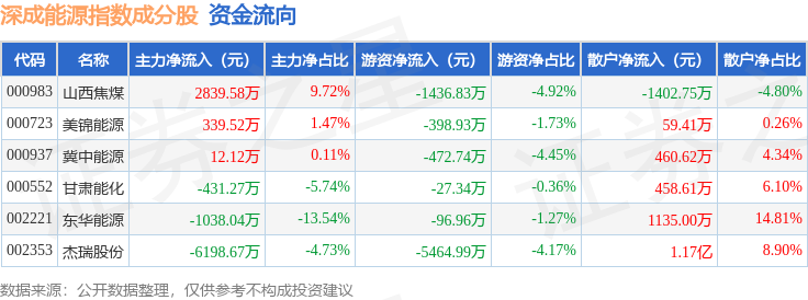 资金流向方面,深成能源(399680)指数成份股当日主力资金净流出合计4476.77万元,游资资金净流出合计7897.8万元,散户资金净流入合计1.24亿元。成份股资金流向详情见下表: