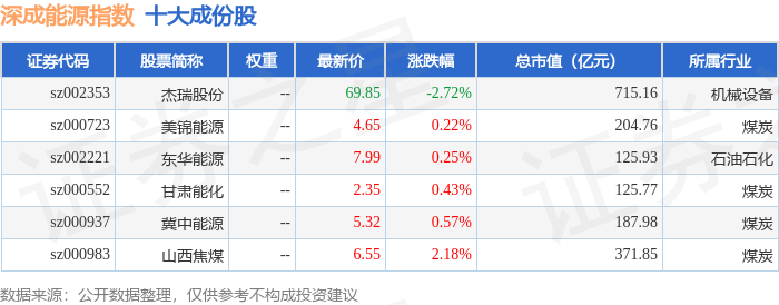 证券之星消息,12月18日,深成能源(399680)指数报收于753.61点,跌0.79%,成交20.92亿元,换手率0.95%。当日该指数成份股中,上涨的有5家,山西焦煤以2.18%的涨幅领涨,下跌的有1家,杰瑞股份以2.72%的跌幅领跌。