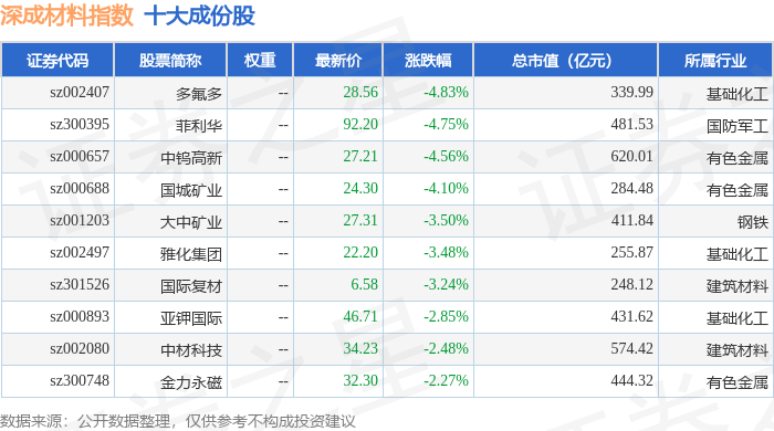 证券之星消息,12月18日,深成材料(399681)指数报收于1219.23点,跌0.66%,成交567.63亿元,换手率1.41%。当日该指数成份股中,上涨的有36家,中简科技以2.86%的涨幅领涨,下跌的有41家,多氟多以4.83%的跌幅领跌。