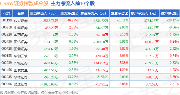 资金流向方面,CSSW证券(399707)指数成份股当日主力资金净流出合计29.67亿元,游资资金净流入合计12.37亿元,散户资金净流入合计17.3亿元。成份股资金流向详情见下表: